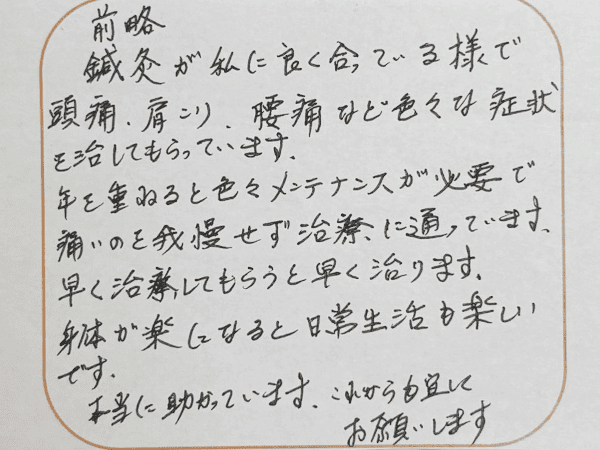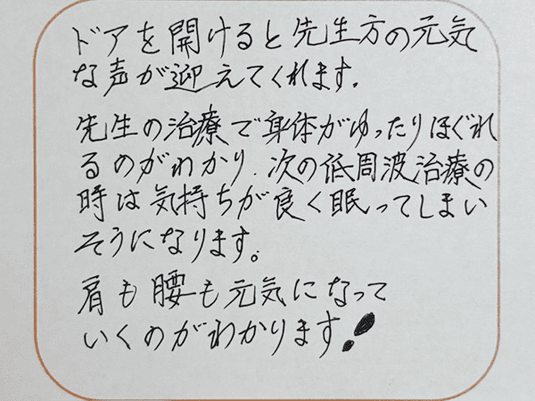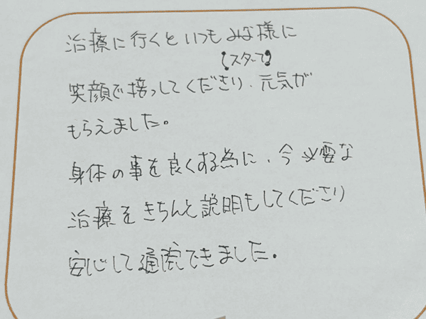 腰痛の施術をしていただいた際、一回でとても腰が軽くなり、本当に助かりました。腰が痛い方はぜひ先生の施術を受けてみてください。