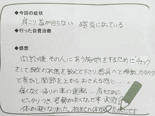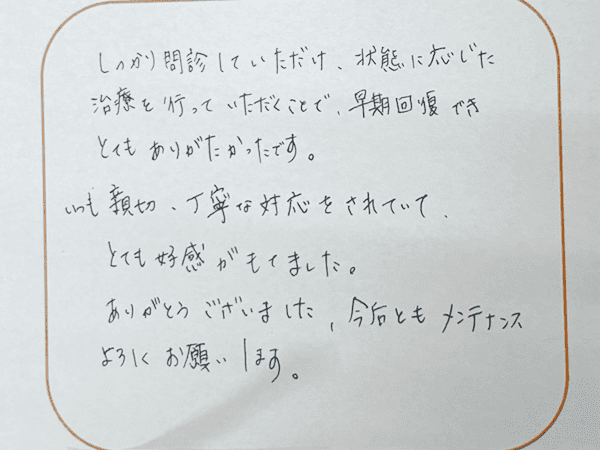 しっかりカウンセリングしていただけ、状態に応じた施術を行っていただくことで早期回復できとてもありがたかったです。 いつも親切、丁寧な対応をされていて、とても好感がもてました。 ありがとうございました。 今後ともメンテナンスよろしくお願いします。