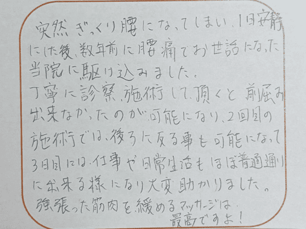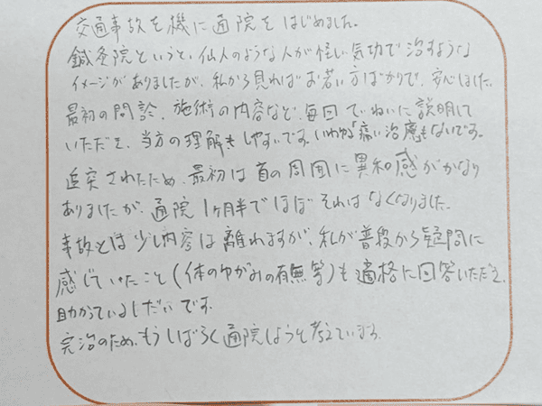 事故とは少し内容は離れますが、私が普段から疑問に感じていたこと(体のゆがみの有無など)も的確に教えていただき助かっている次第です。