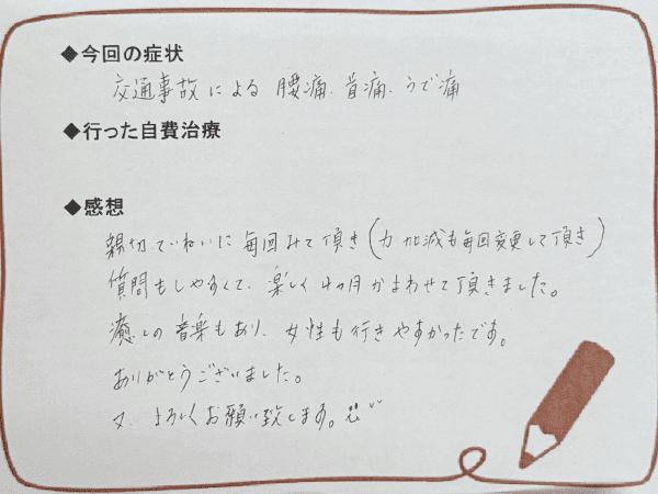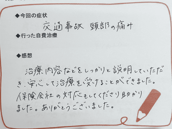 施術内容などをしっかりと説明していただき、安心して施術を受けることができました。 保険会社の対応もしてくださり助かりました。ありがとうございました。